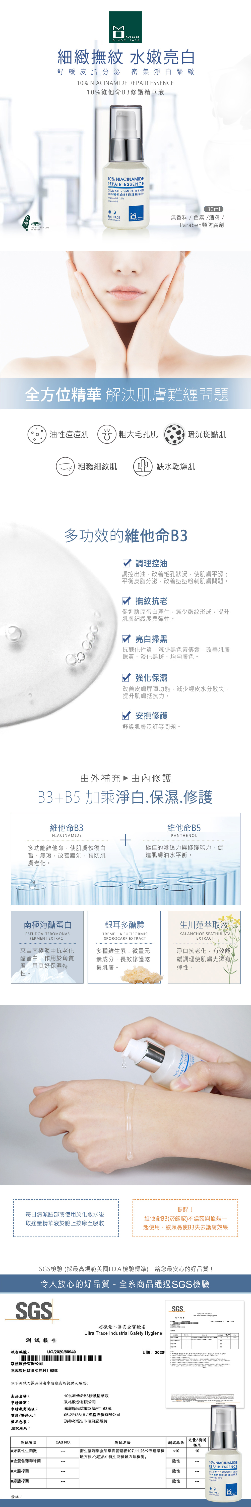 10%維他命B3與維他命B5雙重修護,有效改善肌膚黯沉、亮白肌膚、調理皮脂分泌,